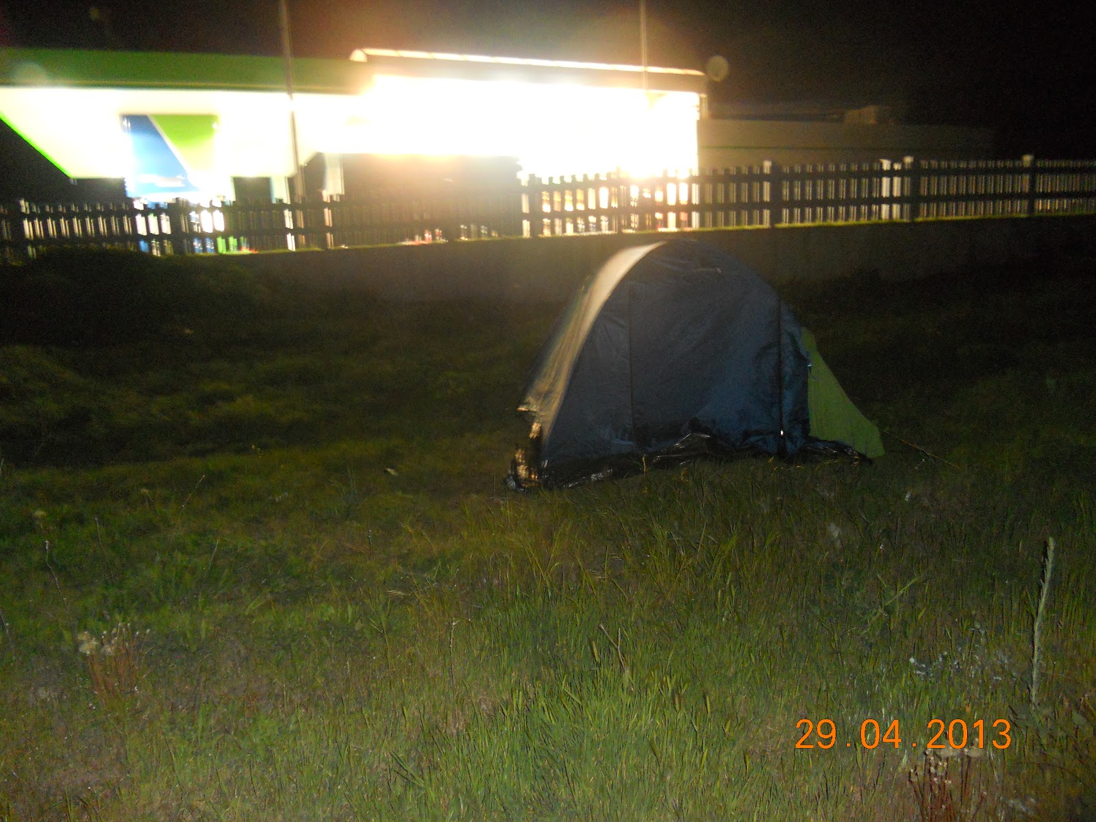 . SFARSITUL PRIMEI ZILE 3:12 Dupa inca 10 km de mers in afara Buzaului, am gasit un bun loc pe un camp , nu departe de sosea, sa instalez rapid cortul. Am avut mare grija sa nu afectez vreo cultura. Cortul e ridicat, dintii spalati, haine schimbate. Rau e ca terenul nu e chiar drept. Dar fiind rupt de oboseala, nu ma mai intereseaza. Ceva,ceva mai atenueaza sacul de dormit.Sa ne auzim / citim cu bine de dimineata . Vise placute despre ceilalti kilometri...